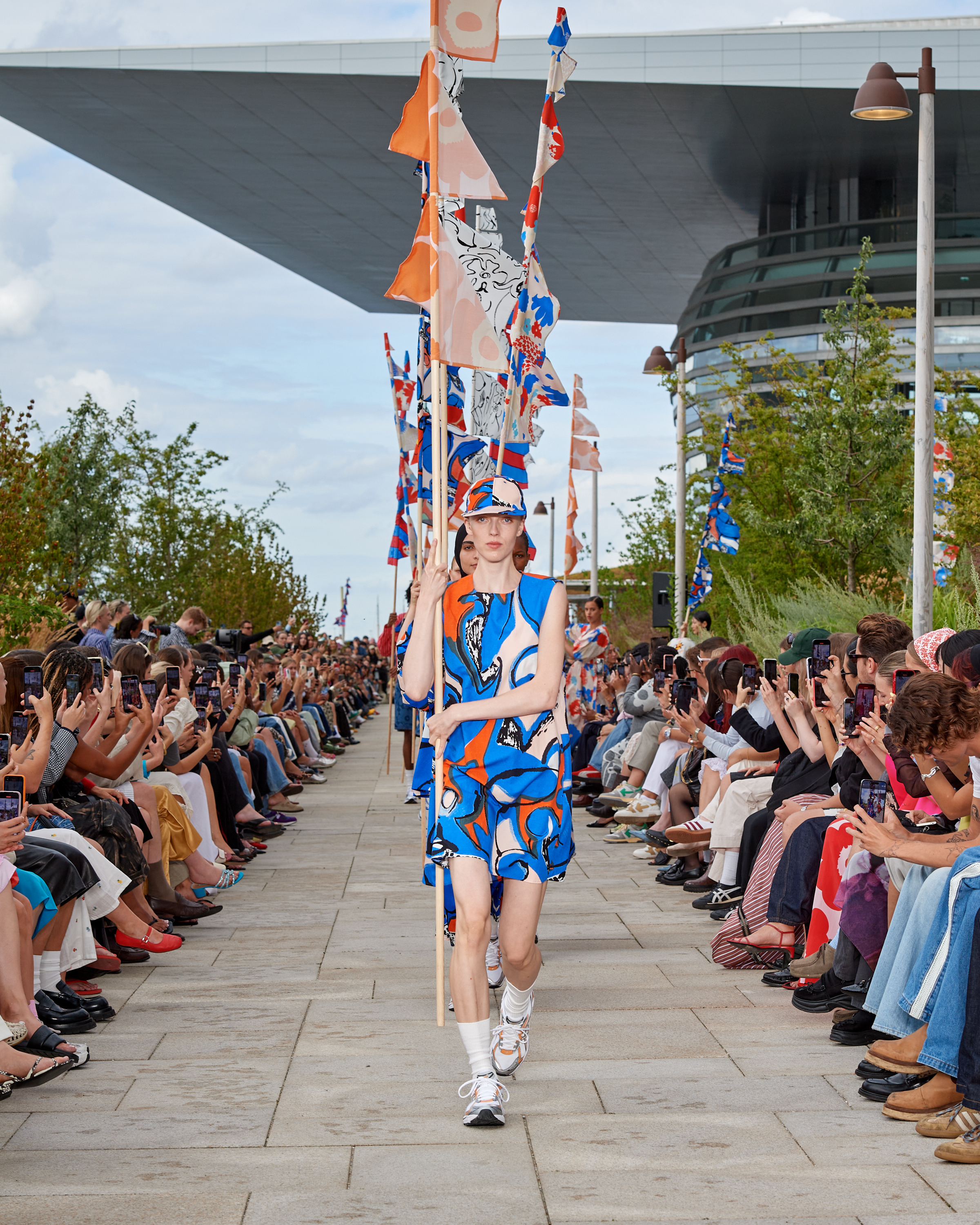 As the first model stepped onto the runway at Marimekko’s Spring/Summer 2025 show during Copenhagen Fashion Week, I was instantly swept into a whimsical garden where modern art and fashion danced together with the effortless grace of a gentle breeze. The vibrant dress, a riot of blues, oranges and blacks, was a wearable canvas—a walking tribute to the era of abstract expressionism.